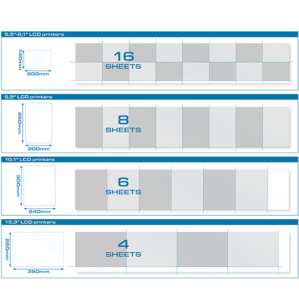 - 4 sheets for 13,3″ LCD printers (260x380mm).